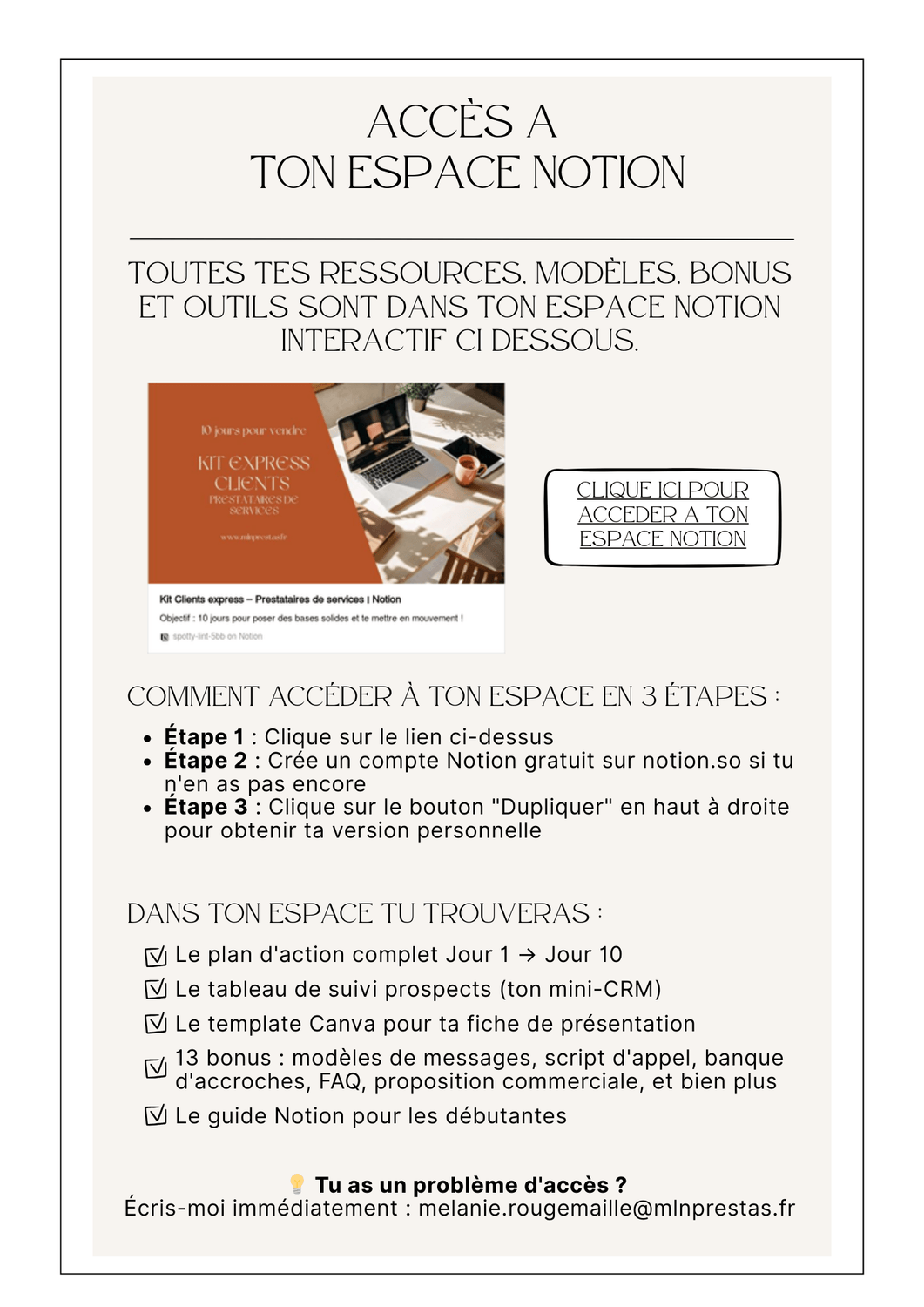 En 10 jours, soit 20 à 30 minutes par jour, tu structures ton offre, tu lances ta prospection, tu décroches tes premiers rendez-vous et tu mets en place un système qui travaille pour toi.